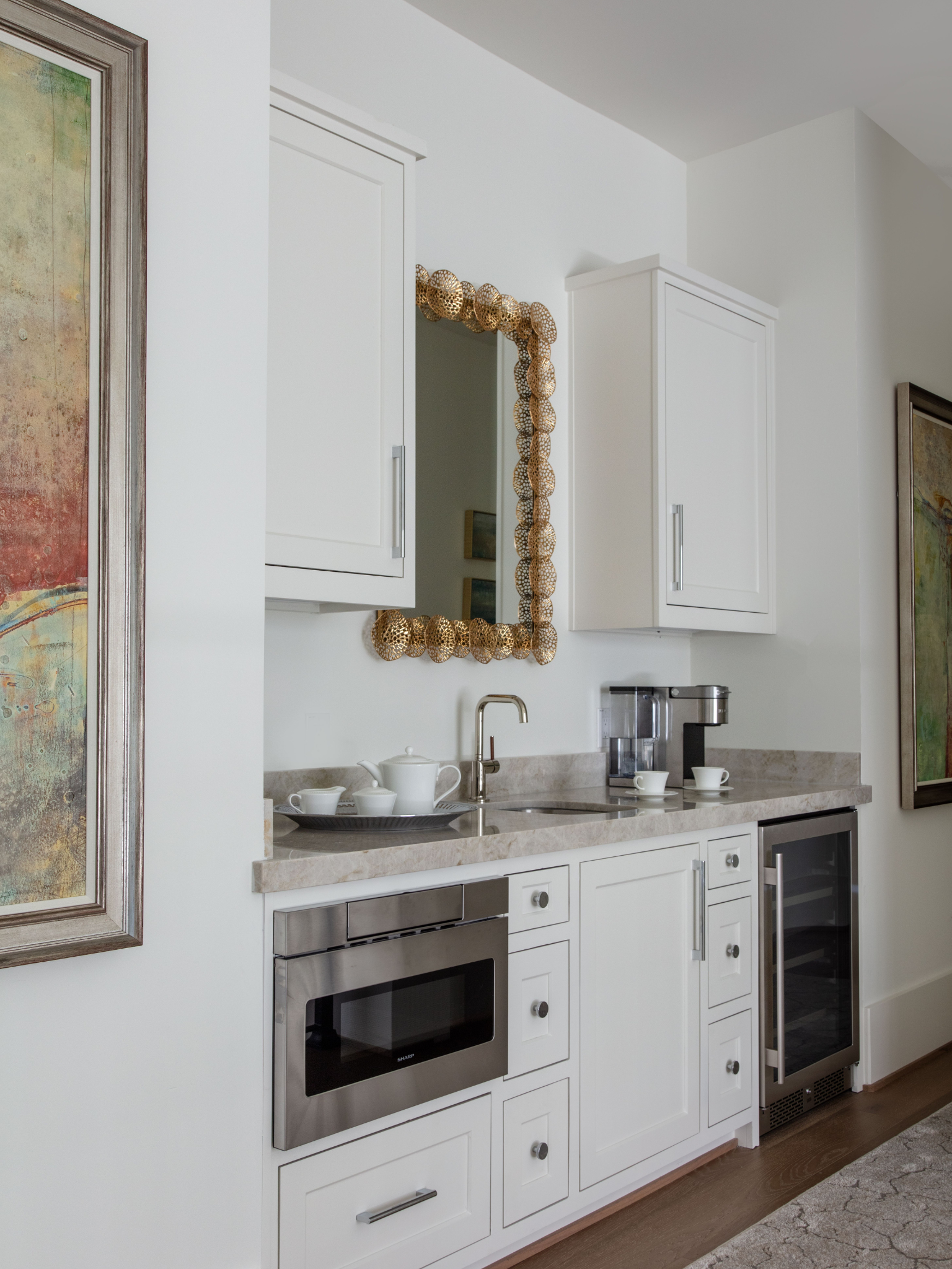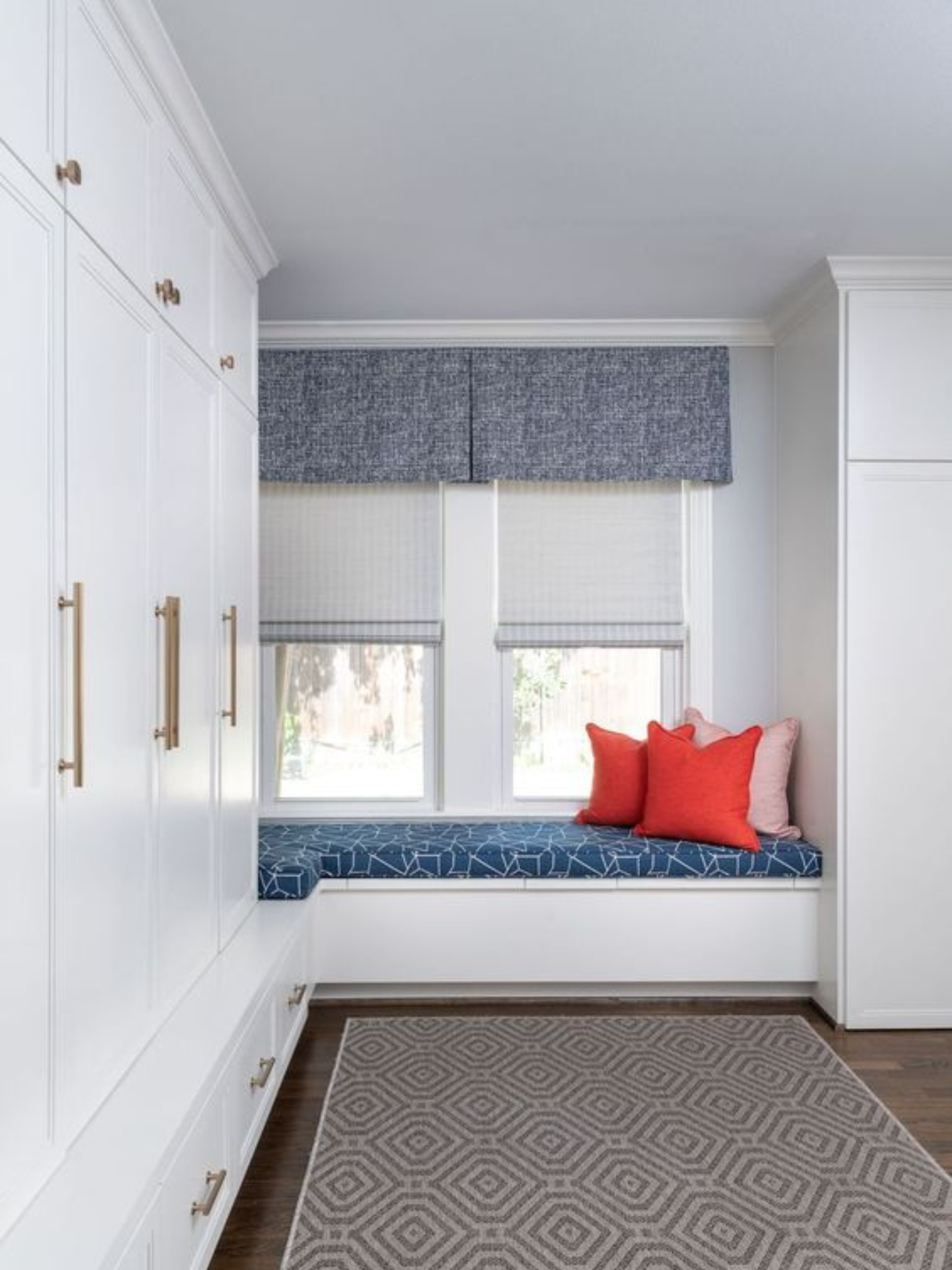 Built-in desks with concealed doors, which are perfect for clients who want a polished living space without visible paperwork. Close the doors, and the office disappears.