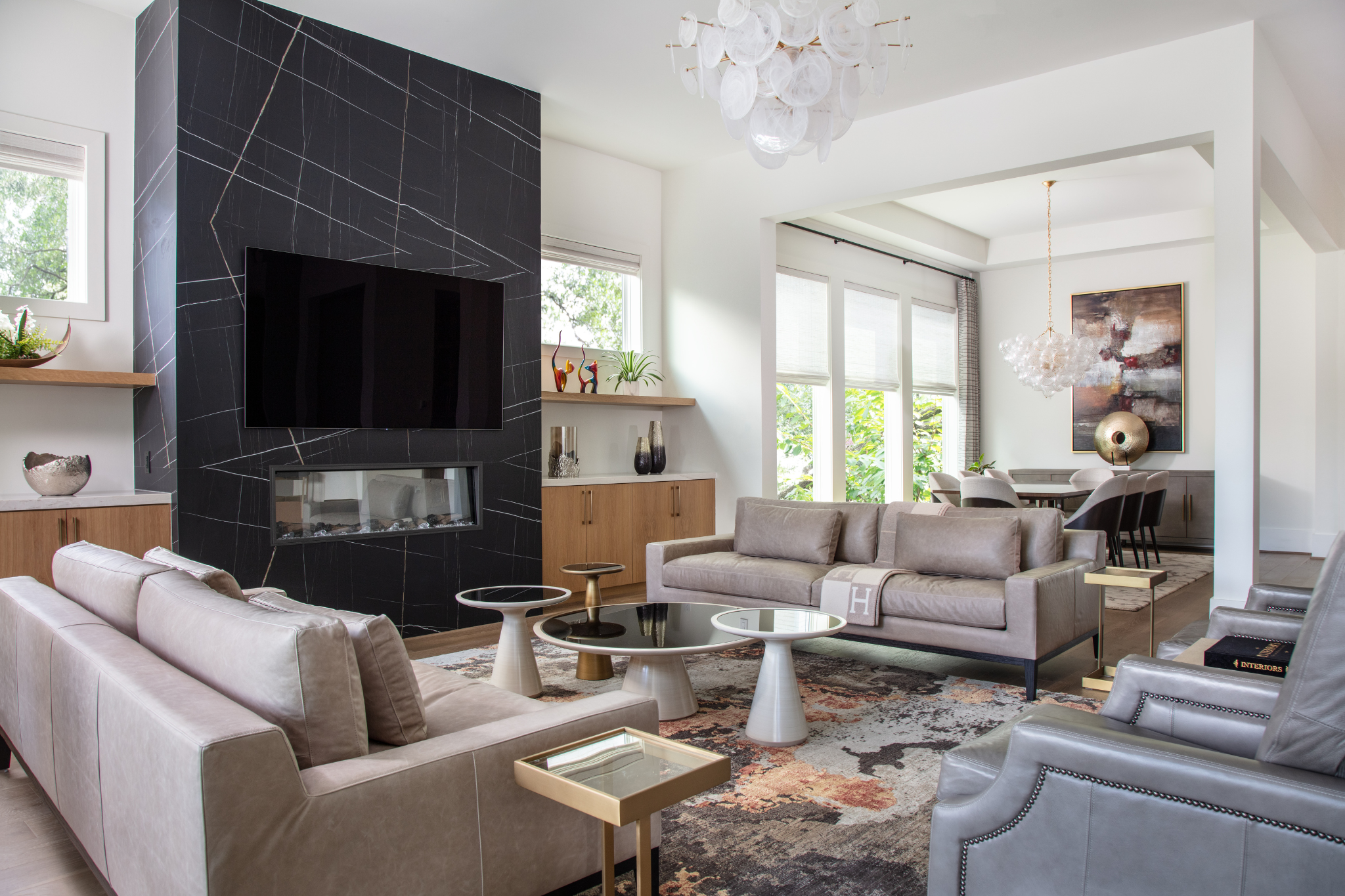 In open-concept homes especially, multifunctional living depends on subtle visual boundaries to keep them from feeling large and lifeless. We like to create “zones” using area rugs to define seating versus work areas, layers of light = pendants, sconces, lamps to signal different moods, furniture placement to create natural flow and open shelving or cabinetry to gently divide without closing off